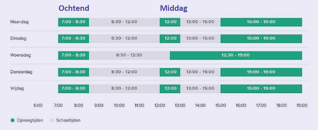 Op maandag, dinsdag, donderdag en vrijdag is de ochtend van 08:40 uur tot 12:00 uur en de middag van 13:00 uur tot 15.00 uur. Op woensdag is de ochtend van 08:40 uur tot 12:30 uur en de middag zijn de kinderen vrij.